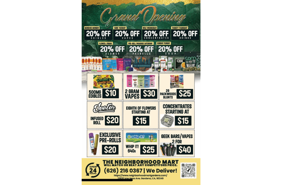 At Neighborhood Mart, we prioritize a welcoming environment and personalized guidance, helping customers discover new favorites and maintain a reliable stock of essentials. Our staff is ready to assist in finding the ideal products for your lifestyle, making every shopping experience seamless and enjoyable. All retail purchases are in-store only, giving you the opportunity to explore, handle, and choose products with confidence. Stop by today and see why our cannabis shop is the preferred destination for those seeking a wide selection of smoke shop products, accessories, and specialty items in Gardena.